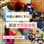 2023年4月7日 / 最終更新日時 : 2023年4月17日 miraikids イベント イベントレポート 英語で茶道体験しました~! このひは雲一つない 春らしいお天気! そんな快晴の中、 未来キッズイングリッシュクラブでは 初の「英語で学ぶ日本文化」として とっておきのイベントを開催いたしました♪ <右写真> 子どもたちと共に初体験した外国人講師ライ […]